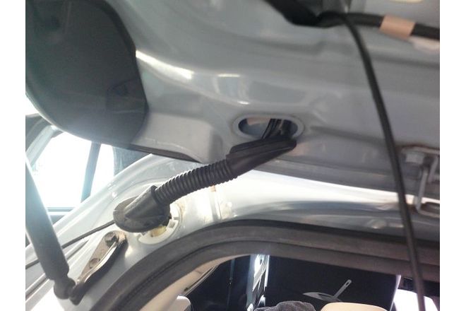 フロントカメラ取り付け位置辺りに電源とリアカメラの配線をもっていきフロントカメラを取り付けます。